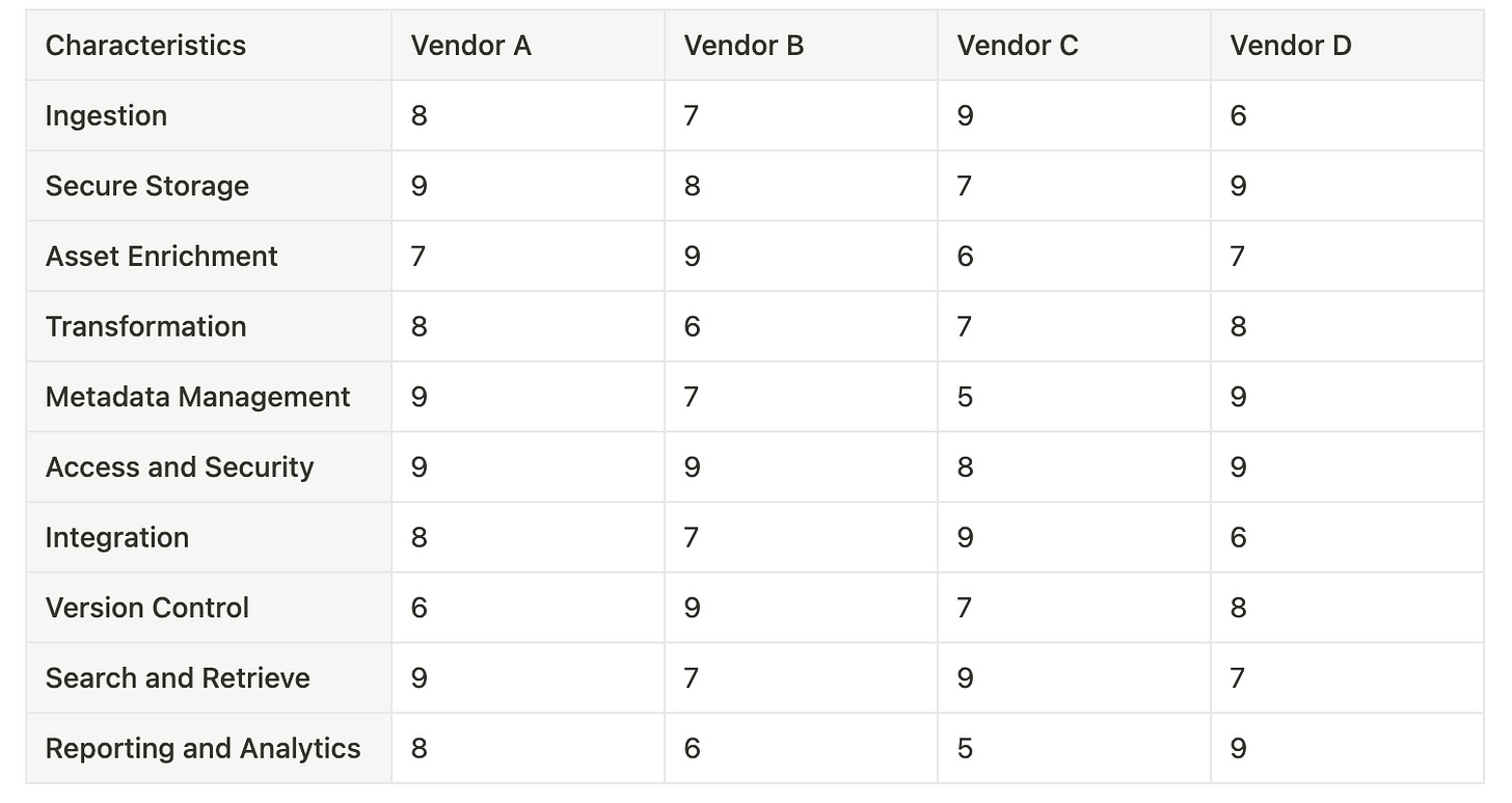 The Ten Core Characteristics framework is a comprehensive tool used to evaluate Digital Asset Management systems across a range of criteria. These characteristics provide a structured way to assess the capabilities and fit of DAM vendors for specific departments and verticals, ensuring that the selected system aligns with unique business needs and operational requirements. Here’s a brief introduction on how Ten Core reports can be effectively utilized for specific departments and verticals: